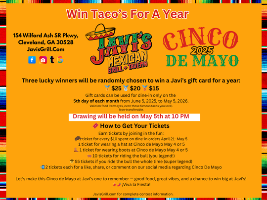 Let’s make this Cinco de Mayo at Javi’s one to remember — good food, great vibes, and a chance to win big!